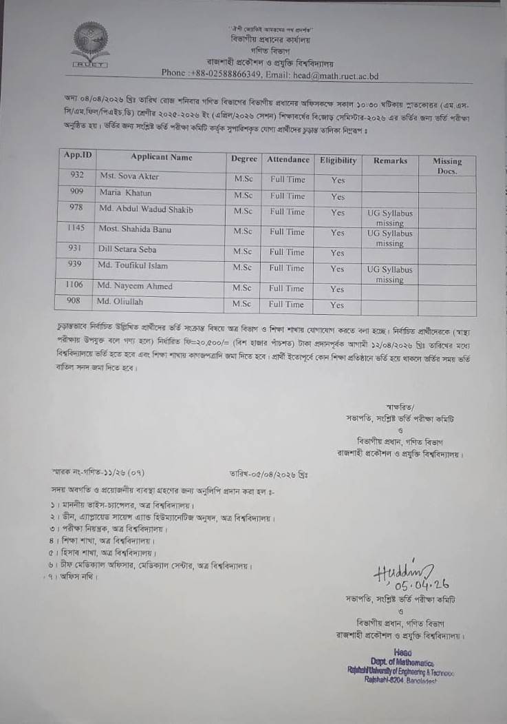 PG Admission Test Result of Mathematics Department April 2026 session